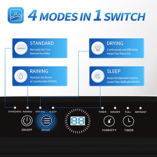 • 4 OPTIONAL MODES: ELECCI dehumidifier for home features four humidity modes, effectively meeting your diverse needs for dehumidification. Simply short press the MODE button and then the HUMIDITY button to customize your ideal humidity from RH40% to RH80% and CO (Continuous Operation) under STANDARD mode, or switch to another mode (DRYING mode with automatic CO status, RAINING and SLEEP mode respectively with default target humidity of RH45% and RH50%). Press and select as you please.