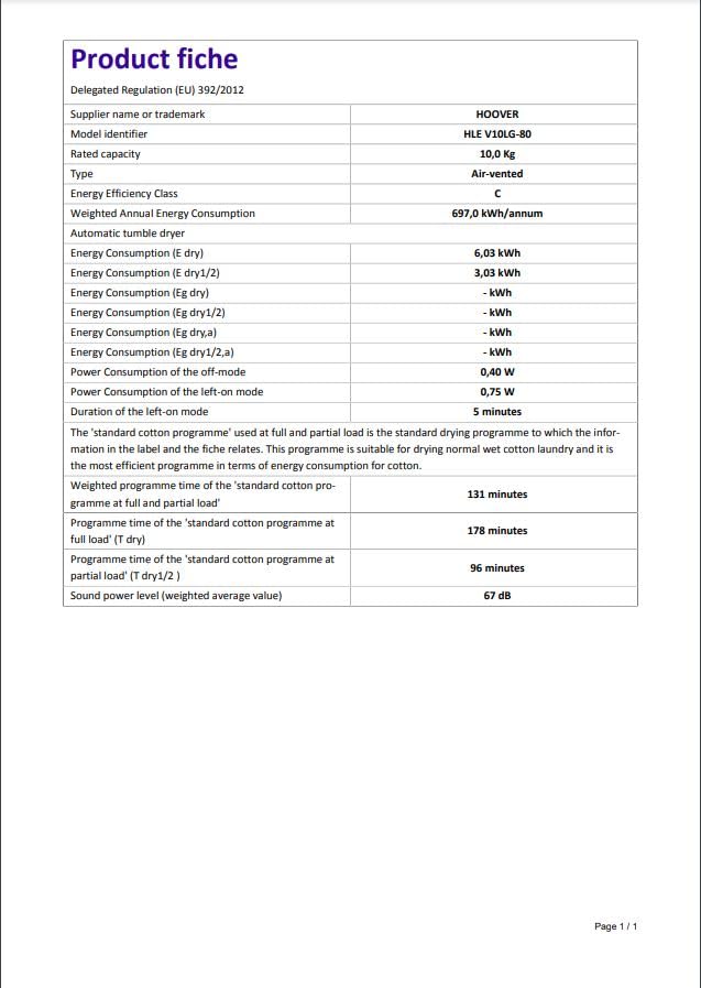 Details: The Hoover HLE V10LG Vented Tumble Dryer has a 10kg load capacity and comes with 14 programmes, including 4 clever sensor dry options and a Timed Drying function. Perfect for a large family, this dryer has been designed with style and practicality in mind. This vented tumble dryer enables water vapours to be expelled through a hose at the rear of the machine which is directed into the open air via an outside wall vent.
