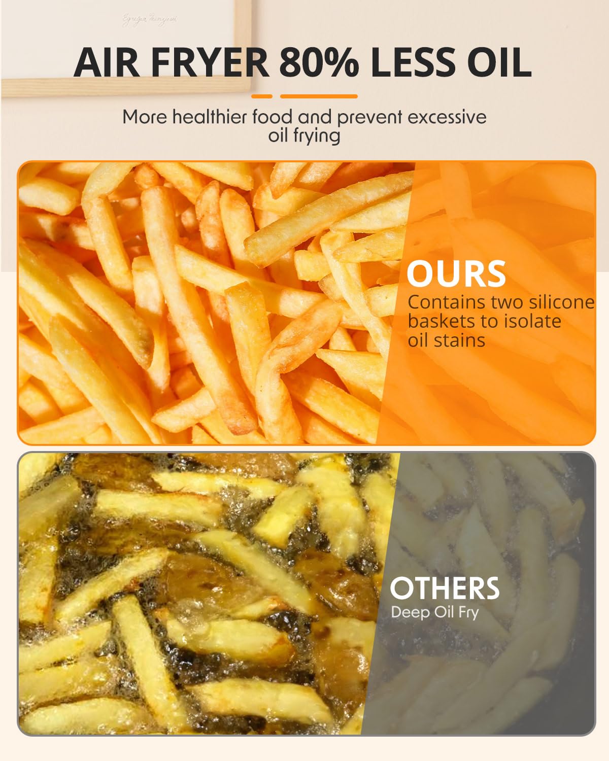 • [Comes with two silicone dishes] The fryer comes with two food-grade silicone dishes for users to hold fried food. The machine is designed with a fast air circulation function, which can heat food evenly, cook quickly, have a crispy surface effect, and reduce grease intake. Each frying basket has a built-in non-stick pan, which is non-stick and easy to clean.