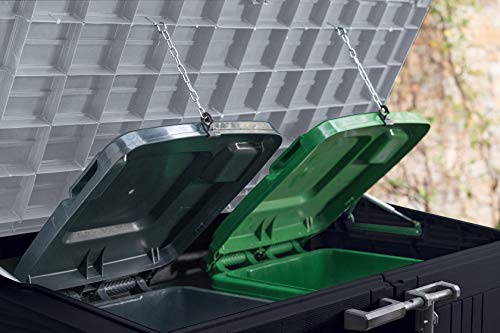 Details: The Store It Out NOVA storage unit has a generous 880L capacity ideal for storing outdoor and garden equipment. It has built in ventilation panels for airflow, a sturdy built-in floor panel to keep your items clean and dry, and even a built-in support for a shelf (shelf not included) to help you make the most of the interior space. This unit has hydraulic pistons to hold the top open and a special bin-opening kit if you're storing two small 120L bins. With two doors on front and a top lid, the Store It Out NOVA’s unique locking system gives you the flexibility to lock the doors and top all together or to lock just the doors and leave the top unlocked for child-safe access from above (padlock not included). Made from durable, weather-resistant, low maintenance resin, the Store It Out NOVA is built to last.