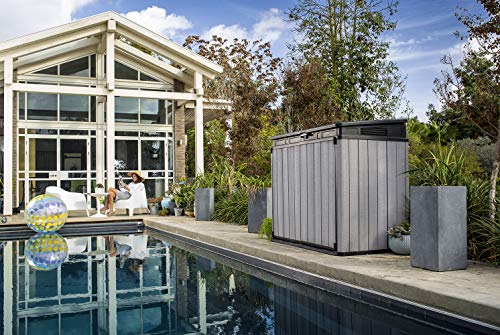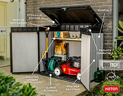 Details: Organize all your garden tools & outdoor accessories in a secure, dry environment with the Keter Elite store horizontal storage shed. Constructed of weather-resistant resin, this shed features one-of-a-kind detach panels, which have a textured, wooden look & can be painted to match your home or outdoor living space. Strong & durable, this shed boasts reinforced double-wall panels & will not rush, dent or peel. It is easy to assemble with its tongue & groove panels. The double doors have chrome hinges & a lockable metal handle to ensure smooth operation & security. Features: Dimensions: 55. 5 in. L x 32. 3 in. W x 48. 6 in. H Floor weight capacity: 30 PSF Roof weight capacity: 15 PSF Can store two 63-gallon trash cans Stylish wood-look texture in neutral colors to complement any home Made from polypropylene resin plastic & steel reinforcement to ensure its durability Bin opening kit included Built-in support for shelving (shelf not included) Weather-resistant, waterproof and UV protected Will not peel, rot or rust Never needs painting Sloped threshold for easy wheeling in and out Opens from the top or the front Wide double front doors Hydraulic pistons for easy opening lid Lockable latch (lock not included) Sturdy floor panel included Ventilation built in