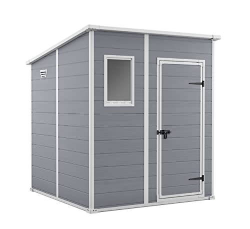 Details: The Keter Pent 6 x 6 shed is ideal for smaller, tighter gardens and locations under low hanging foliage. Complete with a fixed window for daylight access and ventilation. Floor panel included so no concrete or other base is required, just a flat level surface is needed after assembly. The 6 x 6 also has a lockable feature for added security, Its durable resin construction means it is virtually maintenance and fade-free. Just an occasional wash is all that is needed to keep it looking new. External Dimensions: W: 183.5 cm D: 185 cm H: 200 cm.