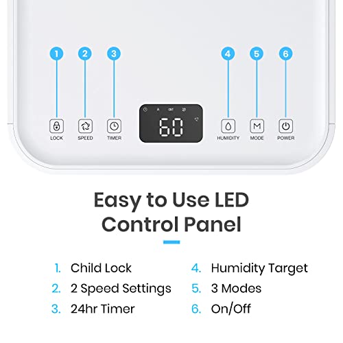 • DIGITAL LED DISPLAY & 24-HOUR TIMER: Programme the dehumidifier for bedroom to turn on or off at any time of the day or night using the 24 hour timer function. The easy-to-read screen allows you to control 3 operation modes including auto, continuous and sleep mode.
