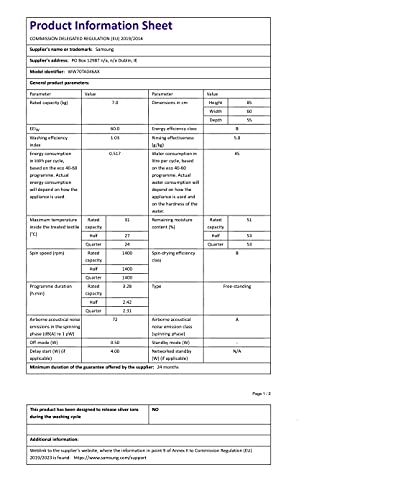 Details: , ecobubble: Make laundry less of a chore. ecobubble technology mixes air, water and detergent to create bubbles that wash your clothes at cooler temperatures. , Hygiene Steam: Banish more than just stains and odours. The Hygiene Steam cycle on your Samsung washing machine releases hot steam, eliminating 99.9% of bacteria and inactivating allergens. Testing done by Intertek on Staphylococcus aureus and Escherichia coli and Dermatophagoides farinae Hughes, on 100% cotton, 3kg load, with standard powder detergent. Individual results may vary. 15 minute Quick Wash , Fabric Care. Drum: No more worrying about your delicates snagging, our unique Fabric Care Drum takes extra care to protect all your clothes. , Drum Clean: Clean clothes start with a clean washing machine. Drum Clean removes 99.9% of odour causing bacteria from the drum, without using any detergents. And after 40 cycles the machine reminds you to run it, so you’ll get the most out of every single wash.