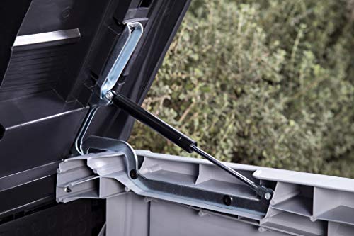Details: Keter Store It Out Ace Wheelie Bin Box Grey. The Keter Store it Out Ace is a storage box that offers dry, ventilated storage space with 1200 litres. The lid of the weather-resistant box lets rain water drain back when opened. Thanks to the optionally lockable (padlock not included in box contents), two 240 litre wheelie bins can be moved without any problems. Store it Out Ace is made of extremely robust, UV-resistant plastic, which is easy to confuse with wood thanks to its grain. Gas lifts for easy opening and closing of the lid and a ventilation system to prevent bad odours are also included. Item features: 1200 litre capacity External dimensions (L x W x H): 145.5 x 82 x 123 cm Internal dimensions (L x W x H): 130 x 74 x 110 cm Material: UV-resistant plastic. With ventilation system to avoid bad odours With pneumatic springs for easy opening / closing Optionally lockable (padlock not included). With bevelled door threshold Space for 2 x 240 litre wheelie bins Easy to assemble Keter brand quality Colour: Grey Wood effect design 1 x Keter "Store it out" Ace wheelie bin box, grey